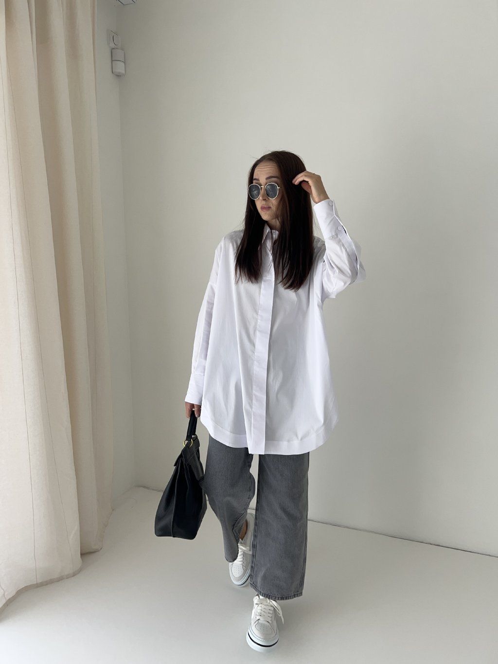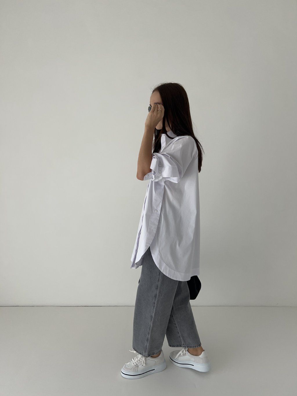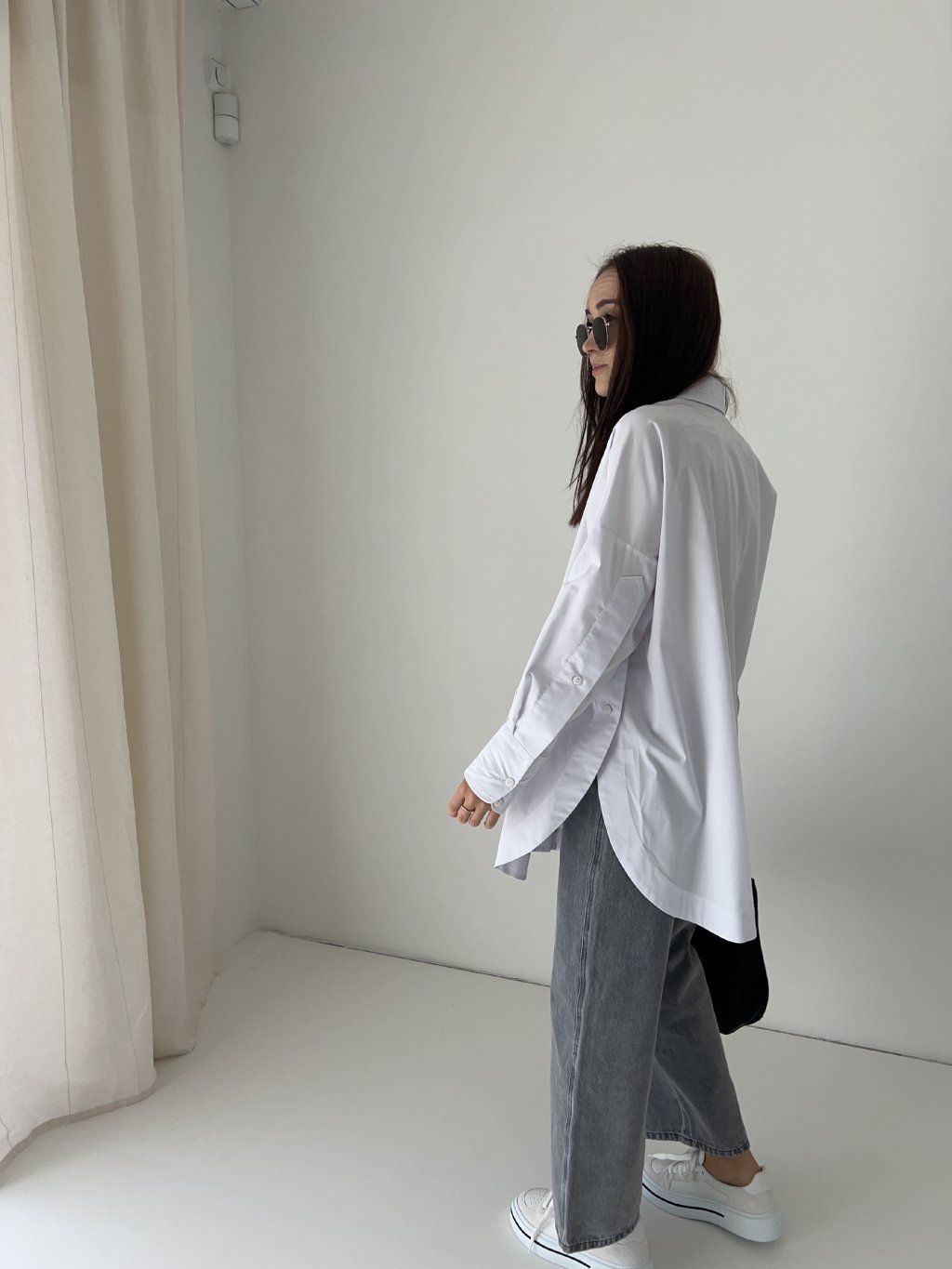 Oversized basic košile s asymetrickým lemem, s dlouhým rukávem a výraznými rozparky. Jedna univerzální velikost (one size). Modelka na fotografii měří 163 cm a obvykle obléká velikost S. Před nákupem doporučuji zkontrolovat níže uvedené míry.