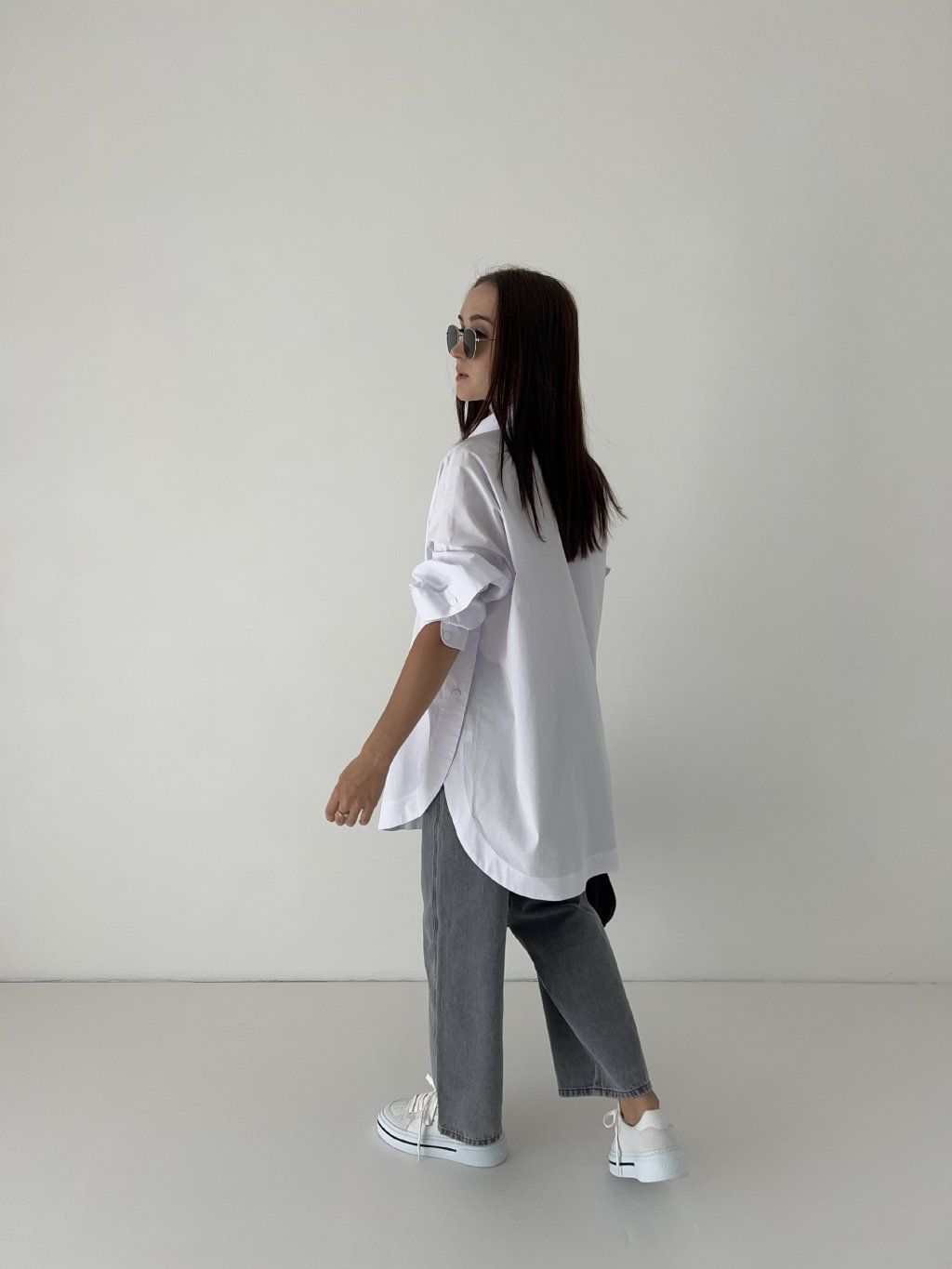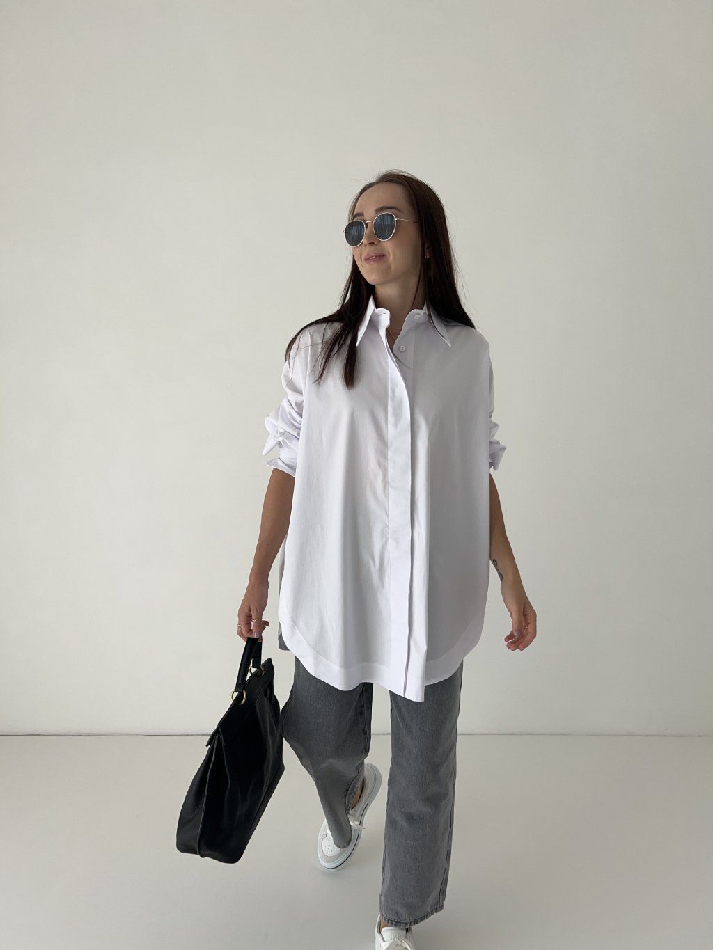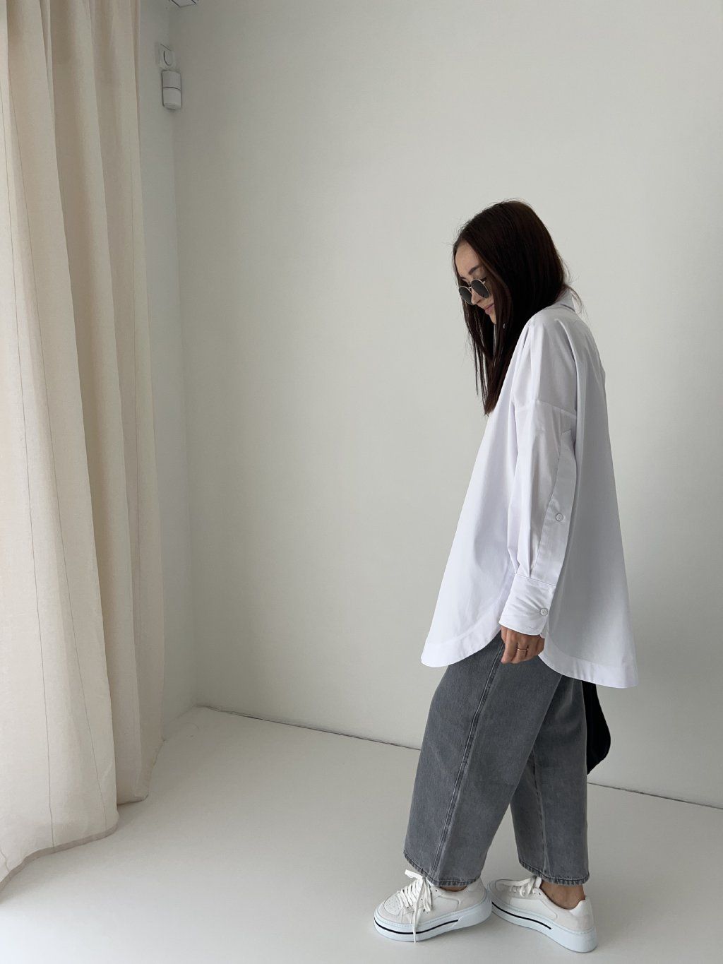 Oversized basic košile s asymetrickým lemem, s dlouhým rukávem a výraznými rozparky. Jedna univerzální velikost (one size). Modelka na fotografii měří 163 cm a obvykle obléká velikost S. Před nákupem doporučuji zkontrolovat níže uvedené míry.